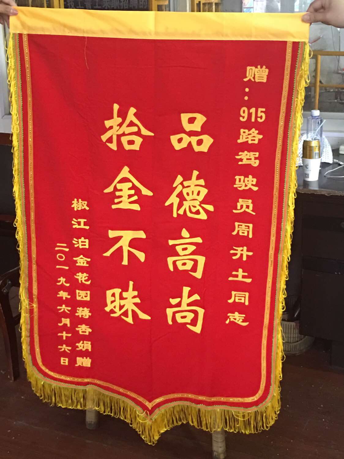 6月17日上午,一面鲜红的锦旗送到了巴士公司二公司五车队办公室,“品德高尚、拾金不昧”八个大字静静讲述着915路驾驶员周升土师傅拾金不昧的正能量故事。