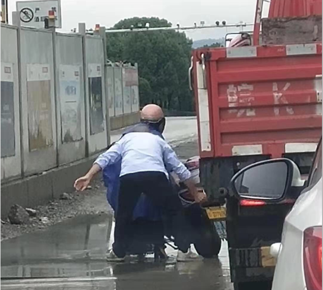 据尤再兵本人回忆说,7月10号下午15:10分左右,他驾驶车辆行驶至财富大道路段,该路段由于正在施工,地势低洼,路面积水比较严重,一名驾驶电动车的女士不慎被临时铺设在路面的钢板刮倒在地。由于穿着雨披,再加上路面湿滑,骑电动车的女士怎么也扶不起车子,情急之下,他将车辆靠边停好,冒雨下车帮忙扶起电动车并推到路旁,再三确认女士没有受伤后,这才放心回到车上,继续投入工作。