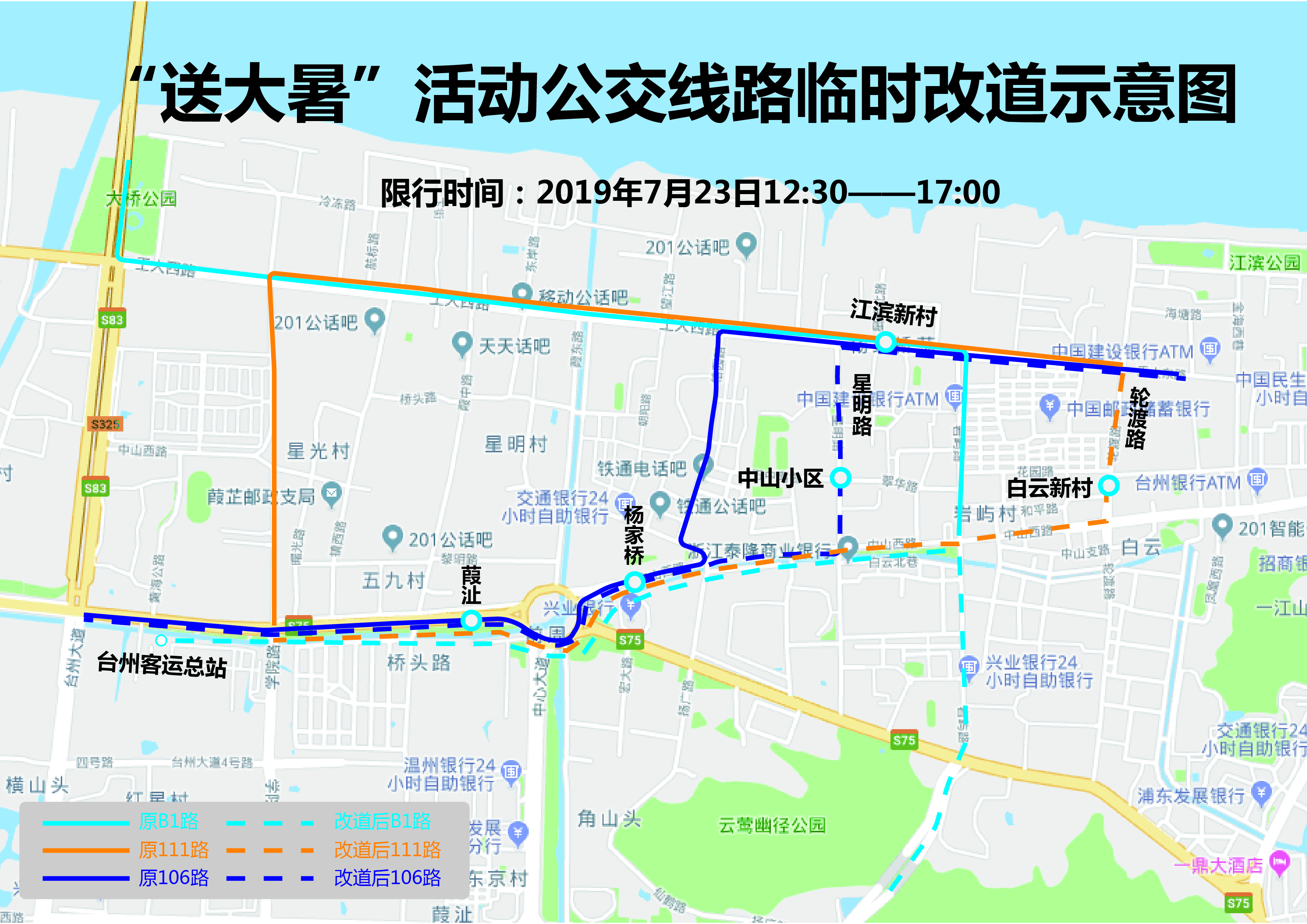 (3)111路临时调整为椒江公交综合场站(始发)-原线路运行至轮渡路-中山西路-中山西路-椒黄路原线路至台州客运总站