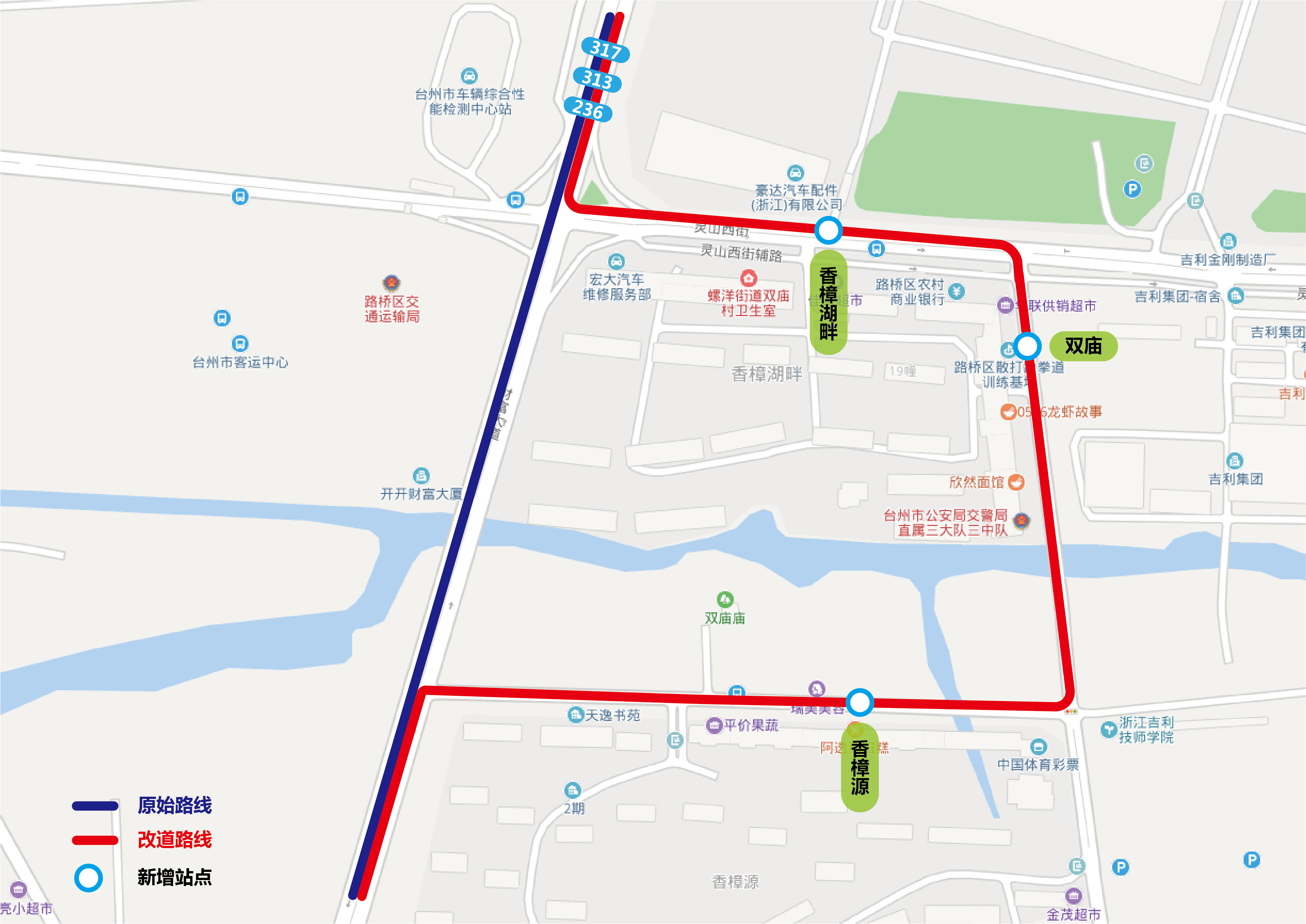 236路、313路、317路:其中236路上行(往恩泽医院方向)、313路下行(往数码城方向)与317路上行(往恩泽医院方向)取消财富大道至灵山西街路段,改由财富大道经双庙路、灵山西街至财富大道,增设香樟源、双庙、香樟湖畔三个站点停靠,236下行(往院桥方向)、313路上行(往螺洋方向)与317路下行(往中岙里村方向)按原线路运行。