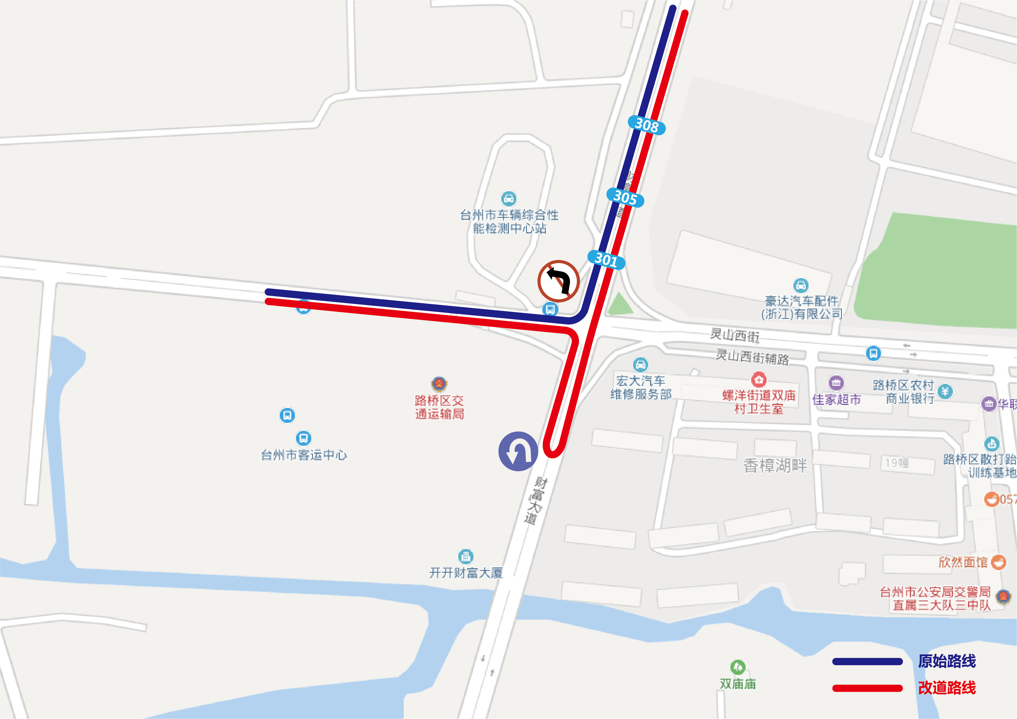 301路、305路、308路:上行保持原线路不变,下行从灵山西街与财富大道交叉口往南100米处掉头至原线路。