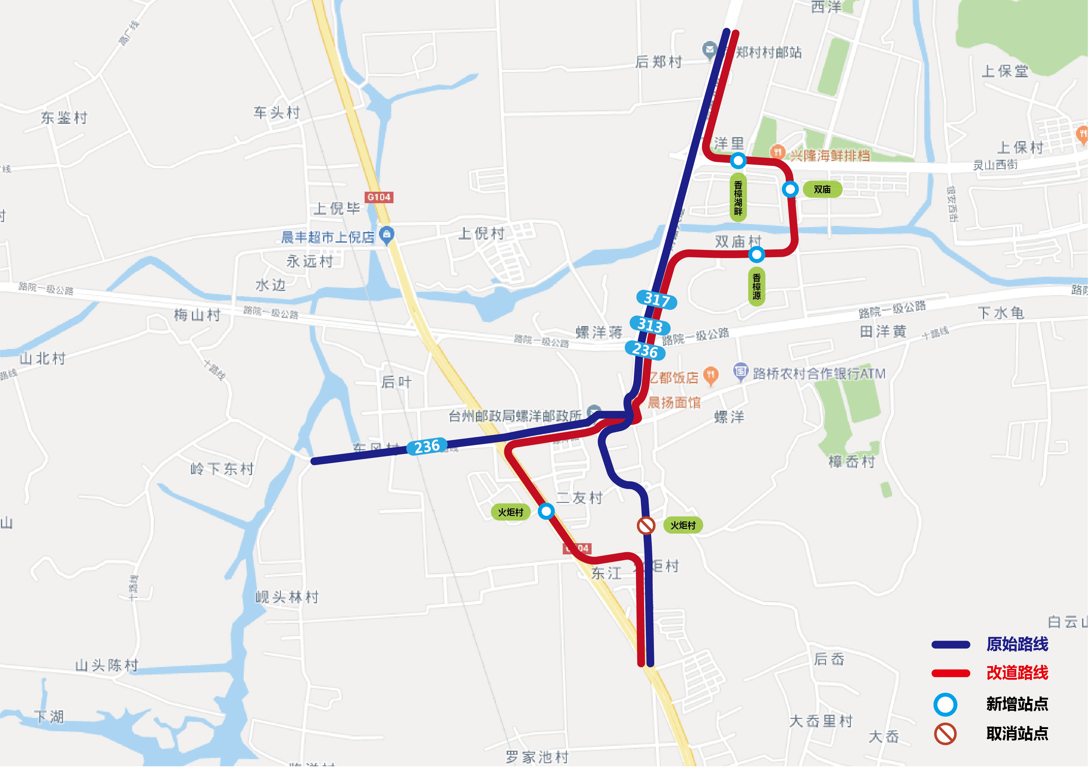 236路、313路、317路:取消财富大道至灵山西街路段,改由银安西街经双庙路、灵山西街至财富大道,增设香樟源、双庙、香樟湖畔三个站点停靠,其中313路与317路永久取消022乡道火炬村至螺洋街一段,改由G104国道经十路线至螺洋街。