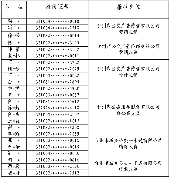 根据《台州市公共交通集团有限公司关于下属子公司公开招聘工作人员的公告》及各职位报名情况,下属竞争性子公司中的台州市城乡公交一卡通有限公司销售人员岗位因报名人数不足,报经集团审核后同意该岗位招聘人数核减至1名。现经组织招聘资格审查,下列报名人员通过资格审核,拟进入下一招聘程序。具体名单及考试安排如下: